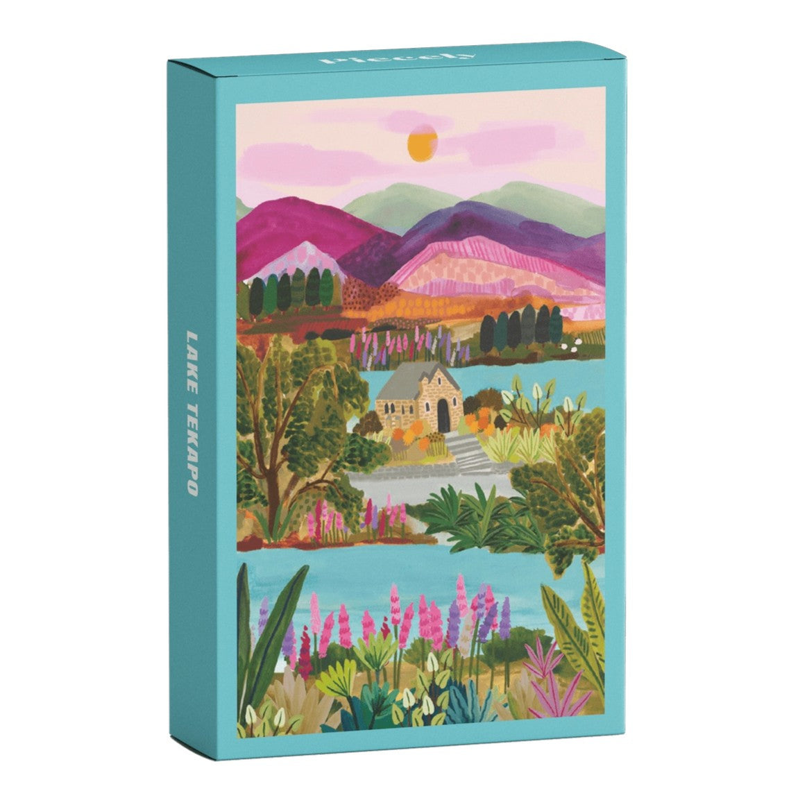 Pusslet visar det kristallklara bergs- och sjölandskapet runt Lake Tekapo – djupblått vatten, frisk luft, rent lugn. Plastfri förpackning och tillverkad av återvunnen kartong – perfekt för en kreativ stund eller som en present med perspektiv. Förvandla ditt vardagsrum till en utsikt. Illustrerad av Rhi James.
